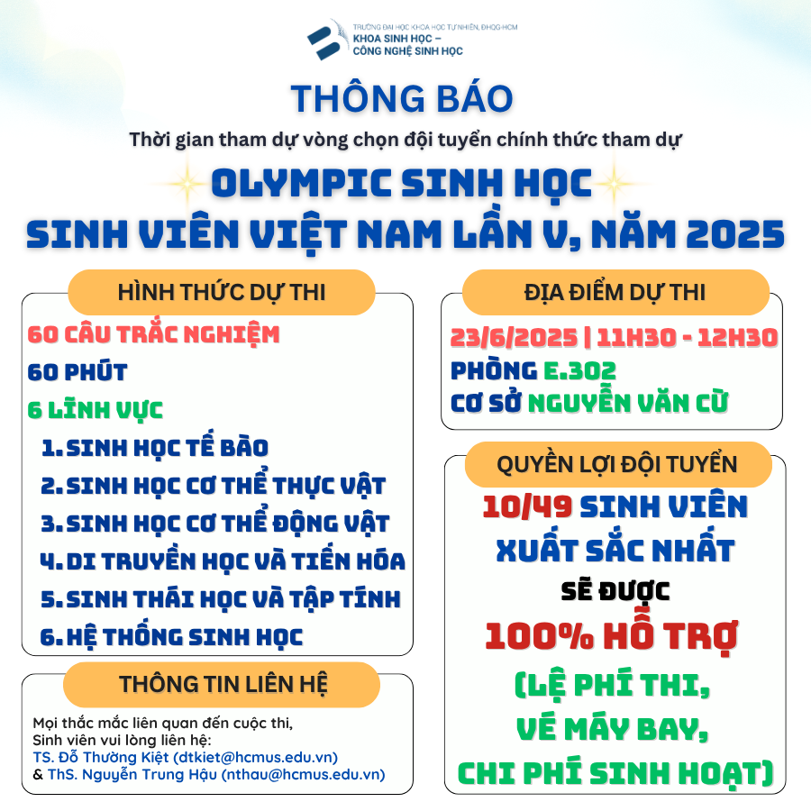 Thông báo số 1 từ Ban tổ chức về cuộc thi “Olympic Sinh học Sinh viên toàn quốc” lần thứ V, năm 2025: https://drive.google.com/file/d/17jWNWOQMVUUW6B_jLOUlPME1dz6dA9Ny/view?usp=drive_link