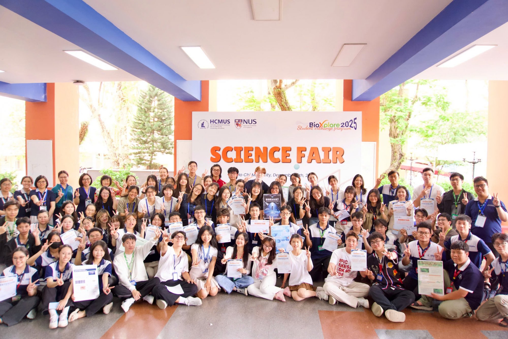 Trong khuôn khổ chương trình BioXplore 2025 – Student Exchange Program giữa Trường Đại học Khoa học tự nhiên, ĐHQG-HCM (HCMUS) và Đại học Quốc gia Singapore (NUS), sự kiện Science Fair – BioXplore 2025 đã diễn ra vào sáng ngày 09/12/2025 tại Hội trường và Sảnh nhà I, mang đến một không gian khoa học trẻ trung, sáng tạo và đầy cảm hứng.